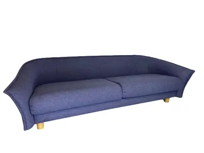 Soffa från Swedese i blått tyg med utsvängda armar och träben. Sitthöjd 44cm.