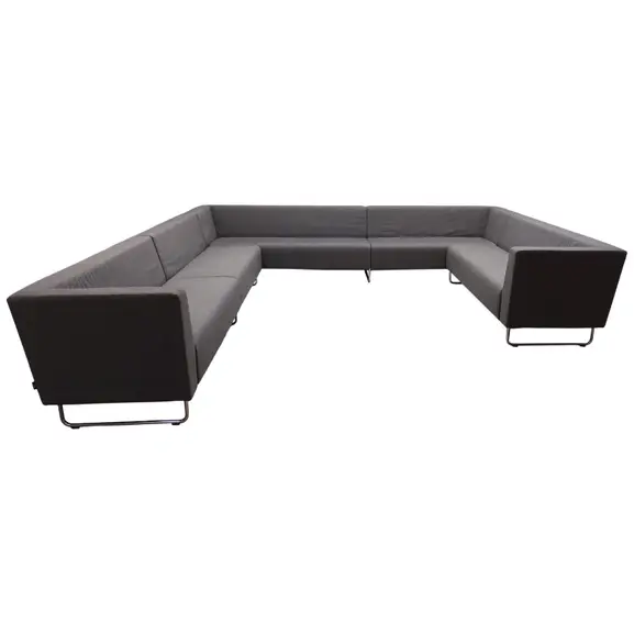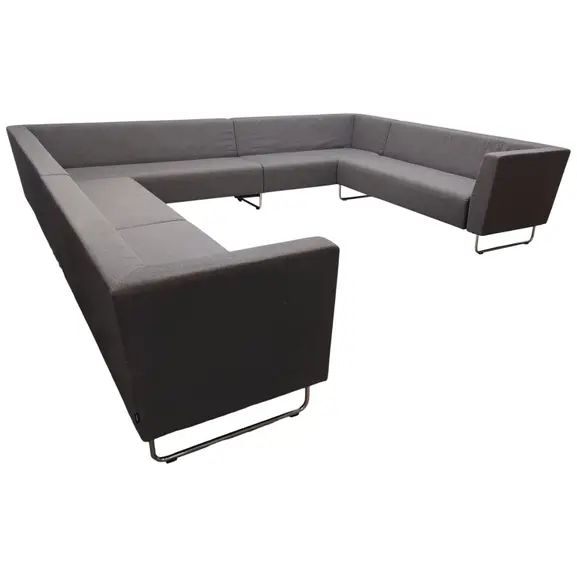 En gedigen soffa i fem moduler i serien Gap Lounge från Swedese. Klädd i ett mörkgrått tyg med medar i krom. Sitthöjd: 42cm.