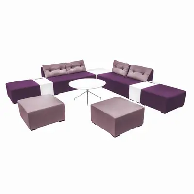 Soffgruppen består av: 2st 70x70cm lila puffar, 2st 140x70cm lila puffar, 2st 140×18-h65cm rygg, 2st 35x70cm Avlastningsbord med eluttag och 1st 70x70cm avlastningsbord, 2st 70x70cm sittpuffar rosa.