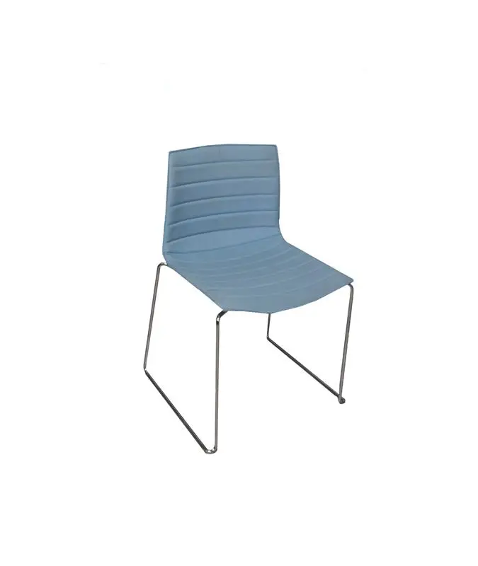 Den välkända designstolen Catifa från Arper. Stolen är klädd i ett blått tyg med kromat underrede. Stolen är staplingsbar.