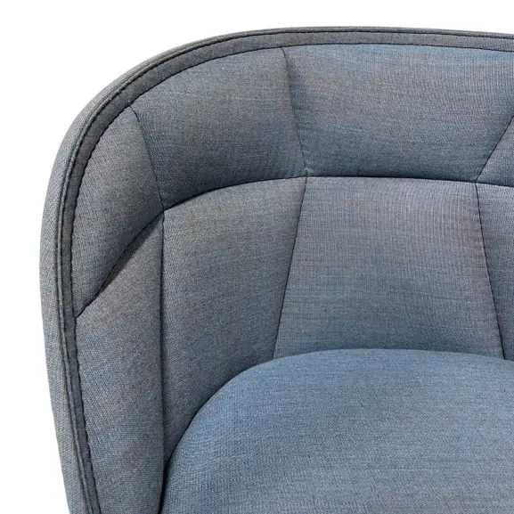 Stolen Emily från Gärsnäs formgiven av designerduon, Fredrik Färg och Emma Marga Blanche. Kan användas både som fåtölj eller som stol i t.ex mötesrum eller samtalsrum. Stolen är klädd i ett blått tyg med dekorativa genomgående stickningar i ryggen och har ben i ask.