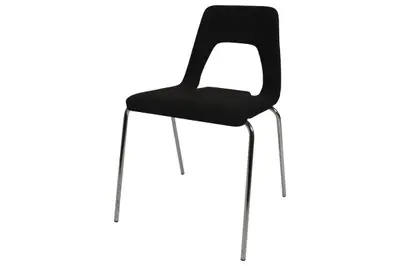 Stapelbar stol i svart slitstarkt tyg, kromade medar.