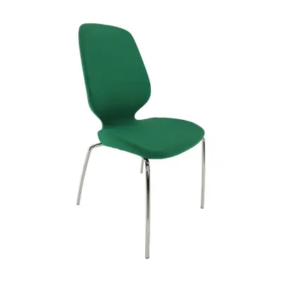 Den väldesignade stolen Monroe från Kinnarps. Stolens rygg och sits är i en gemensam form där Nozag-fjädring i sitsen ger extra bra sittkomfort. Helklädd i ett grönt tyg på ben i krom. Sitthöjd: 48cm.