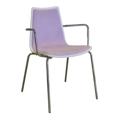 Stol med vit sits och rygg, klädd i lila/rosa klädsel.