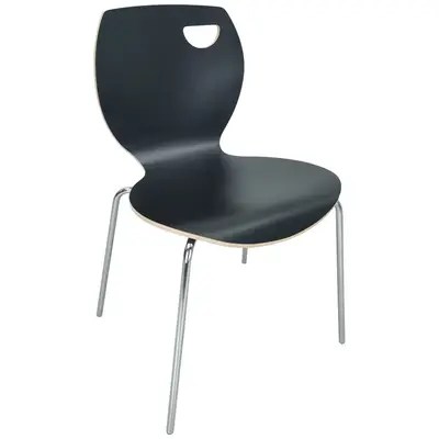 Café IV från Musonas är en stark och tålig matsals-/caféstol av profilerad, svartmålad plywood på kromat underrede. Det utskurna handtaget är både praktiskt och en intresssant designdetalj.