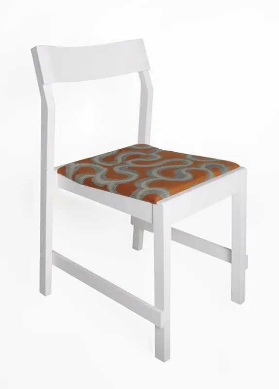 Stolen Rialto 431 från NC Nordic Care i vit bets och med en klädd sits i brunt mönster. Stolen är stapelbar. Sitthöjd: 45cm.