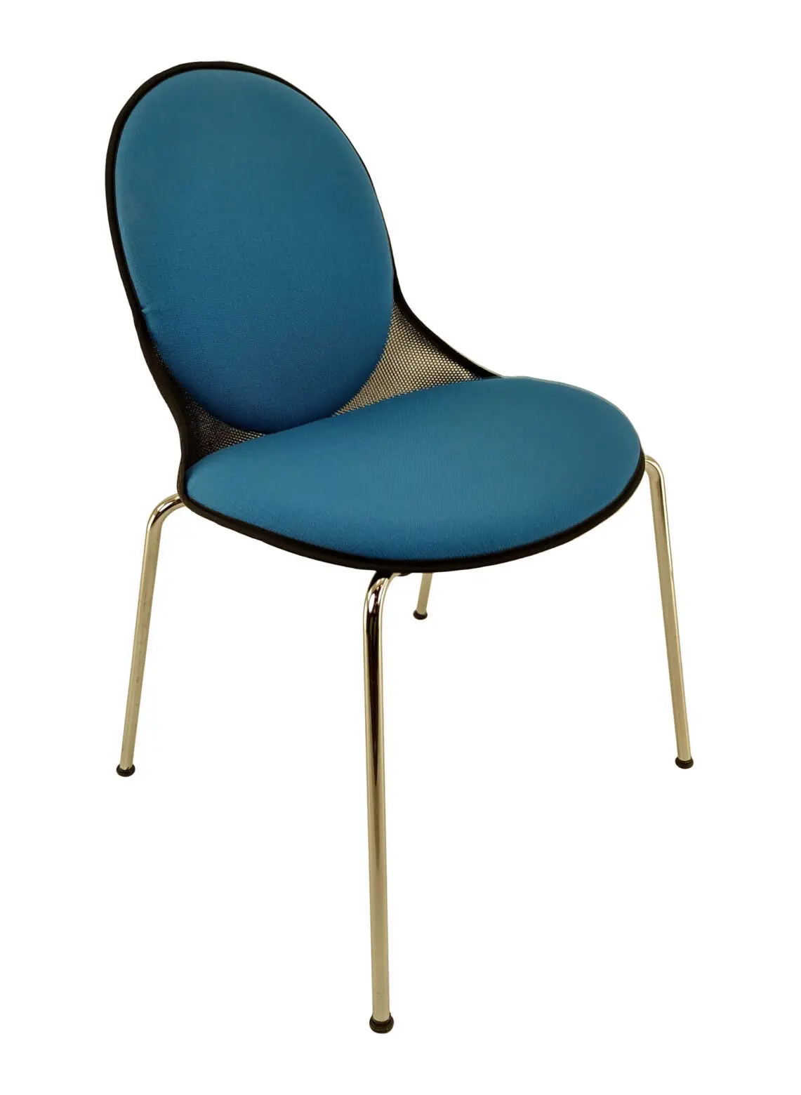 Stolen Louis IX från Offecct, med klädd sits och rygg i blått tyg. Kromat underrede. Stolens mest speciella funktion är dess miljövänlighet. Louis IX-stolens grundskal är gjord av återvunnet schampoo- och tvålflaskor som återvinns genom en blandningsprocess vid hög temperatur. Sitthöjd: 46cm.