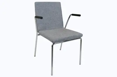 Stol från Skandiform. Stolen är helklädd i ett ljusgrått tyg, stativet är i förkromad metall. Stolen är staplingsbar.