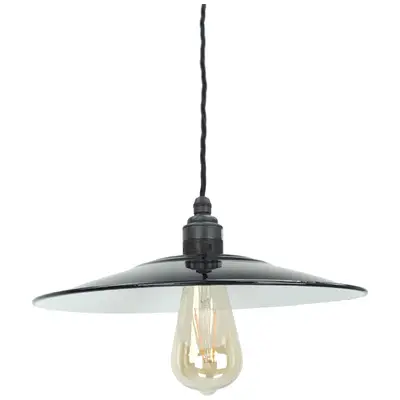 ”Skomakarlampa” i industriell stil. Lampskärm i metall med svart utsida och vit insida. Tvinnad, tygklädd, svart sladd.