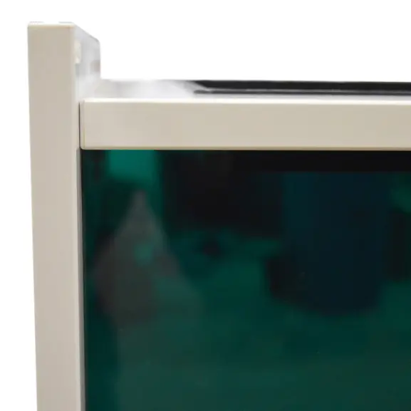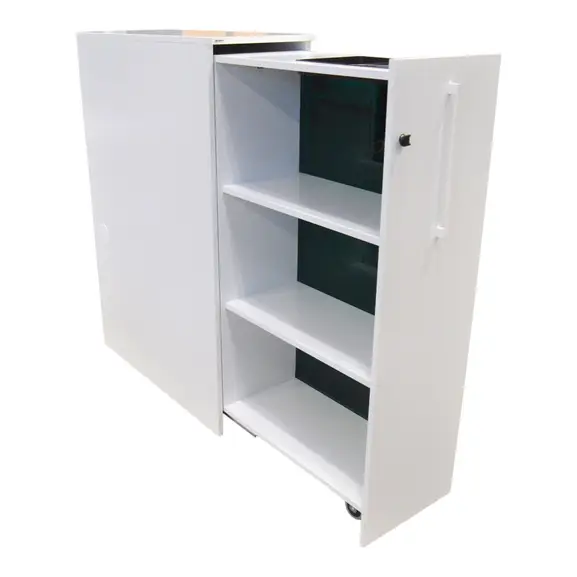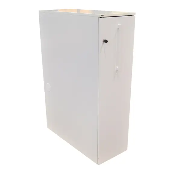 En vit towerförvaring med grön vägg på insidan från Edsbyn som är avsedd för att stå till höger om skrivbordet. Towerförvaringen har ett pennfack ovantill på första hyllplanet för smidig hantering av pennor och dylikt. Låsbar.