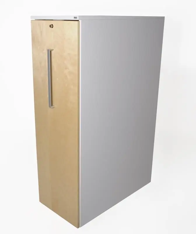 Snygg towerförvaring från Kinnarps. Förvaringens stomme är i vitt och dörren i björk. Förvaringen har ett lås och är avsedd att placeras till vänster om skrivbordet. 3XA4.