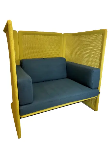 Tyst fåtölj av Steelcase serie Coalesse i blått och gult. Sitthöjd 45cm.